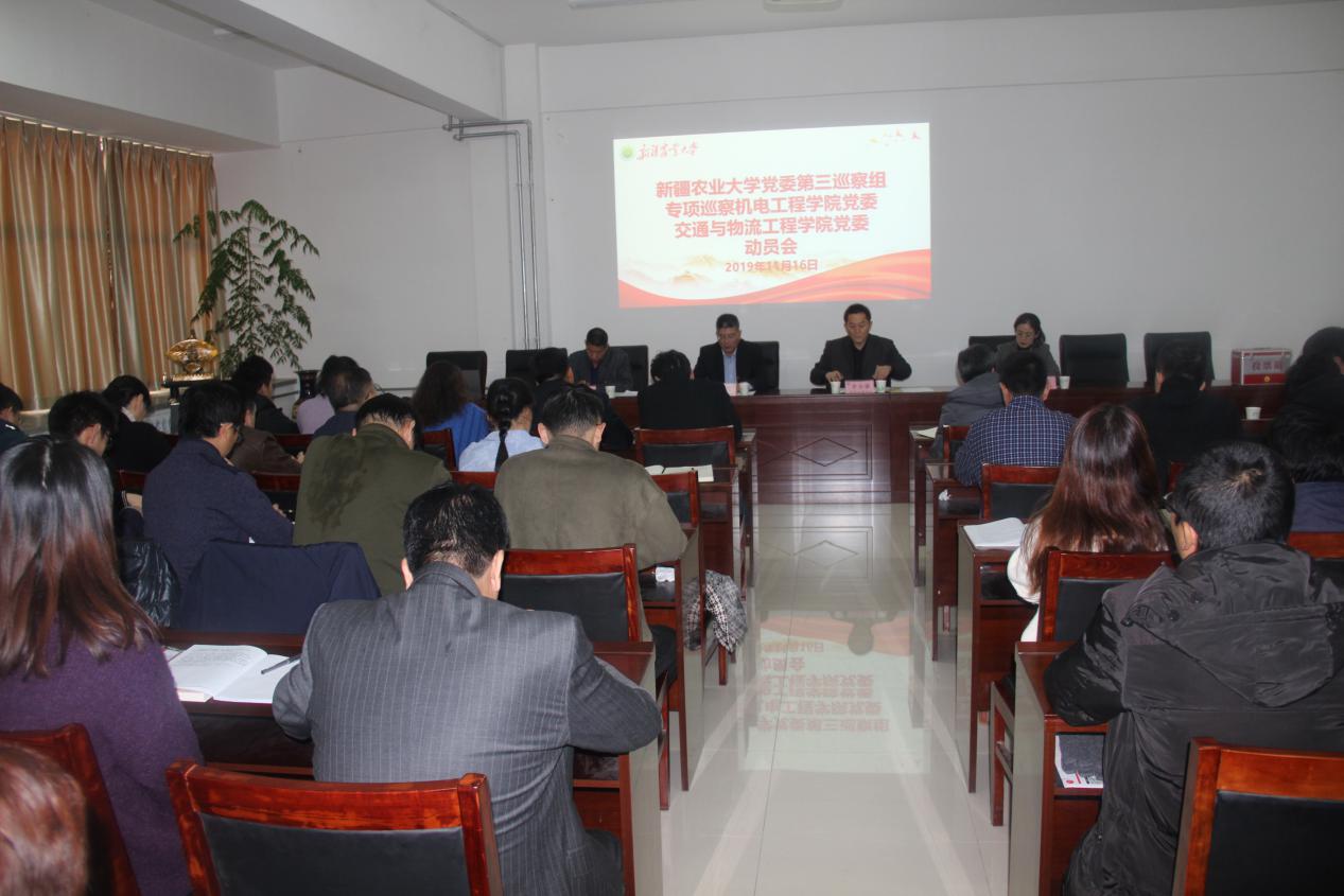 2019年11月16日下午18点,校党委第三巡察组专项巡察机电工程学院党委动员大会在机电工程学院会议室召开。校党委第三巡察组组长金晓龙代表第三巡察组做了动员讲话,校党委巡察办主任,自治区监委驻星空彩票体彩版监察专员办公室副主任李全棋提出工作要求,学院党委书记李贺鹏主持会议并代表交通与物流工程学院党委做表态发言。