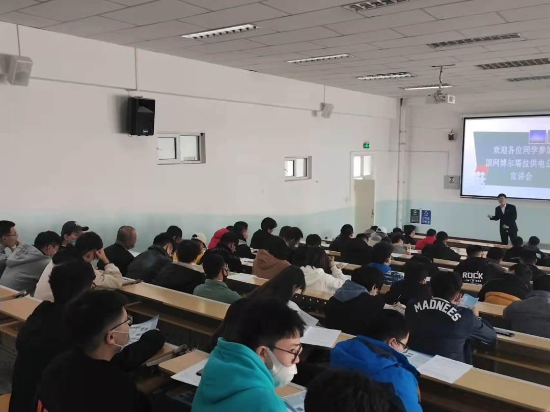国网博尔塔拉供电公司专场招聘会 宣讲人员对公司概况进行介绍;有疑惑的同学对宣讲人员提出问题,并得到公司宣讲人员的一一解答。