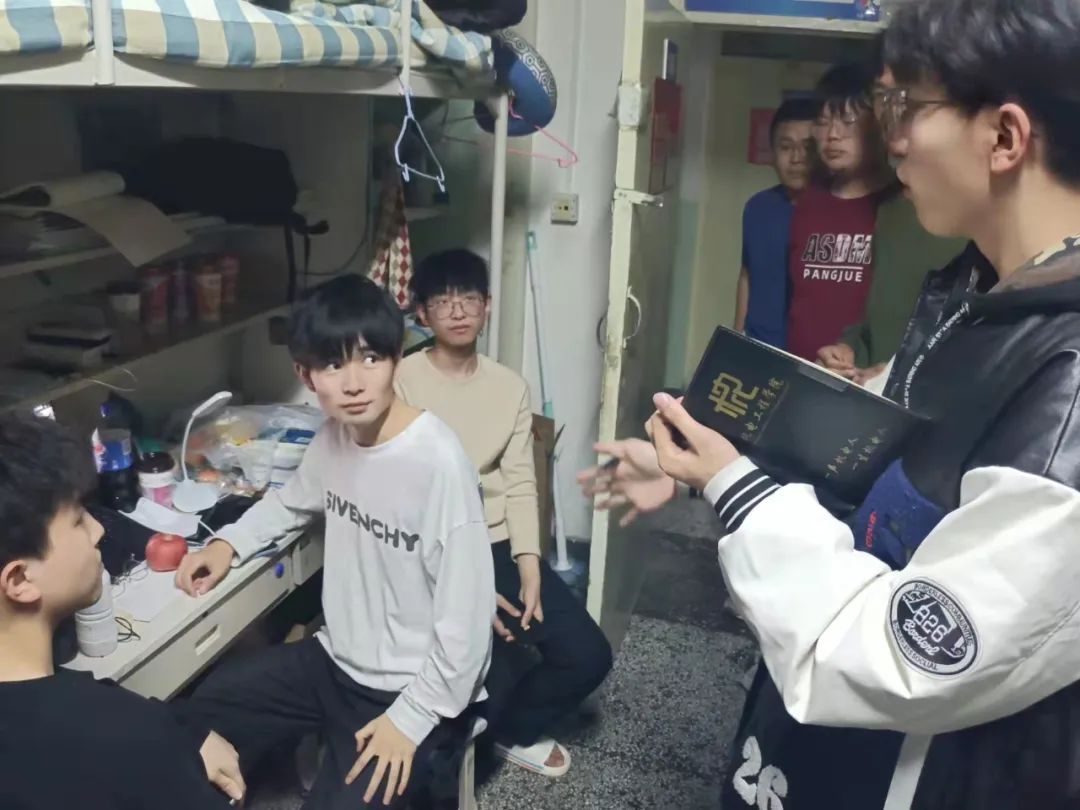 (郭世豪在男生宿舍调研)