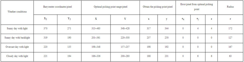 该研究选取4种天气条件下的400幅独立验证红花采摘点定位过程(图3),并计算出4种不同天气条件下试验图像的质心、采摘点像素坐标、最优采摘点所在位置,计算采摘点与最优采摘点之间的误差(表1)。试验结果表明,该研究方法在晴天逆光下求得采摘点/像素与最优采摘点之间无误差,其定位准确率略优于顺光,原因在于光照条件的变化,逆光作用在红花图像上改善了光照强度和亮度,削弱了强光带来的背景色差重叠,更有益于采摘点定位。然而,晴天顺光条件下求得采摘点与最优采摘点之间的误差比晴天逆光条件下多4个像素。顺光作用在红花图像上提高了光照强度和亮度,但是红花的花丝本身与周围的复杂环境相融合,尤其是其他红花丝等,从而导致定位红花的色差与周围背景相同。此外,红花图像提取不完整导致红花丝质心计算误差太大,进而使采摘点定位出现偏差。