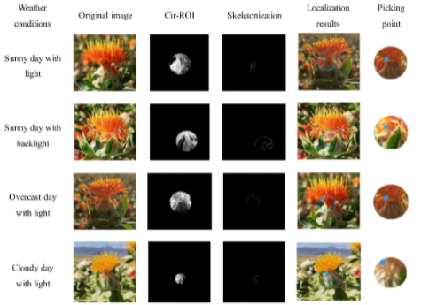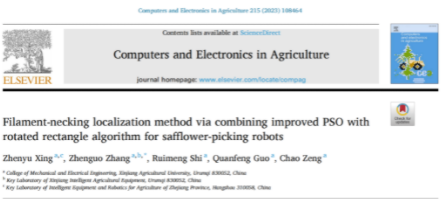 近日,星空彩票体彩版机电工程学院张振国副教授团队Computers and Electronics in Agriculture》在线发表一篇题为Filament-necking localization method via combining improved PSO with rotated rectangle algorithm for safflower-picking robots的研究论文。该研究表明提出一种基于改进粒子群优化算法的花丝-缩颈圆形感兴趣区域采摘点自动定位方法。根据红花颜色和纹理特性,通过改进粒子群优化算法提取分割红花丝最大连通区域,进而采用基于红花几何特征的再分割方法,确定花丝-缩颈圆形感兴趣区域,并采用Zhang-Suen细化算法进行骨架提取,设计红花丝采摘点定位方法,使红花丝高效、低损的完整采摘。