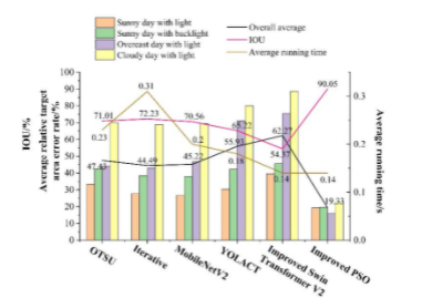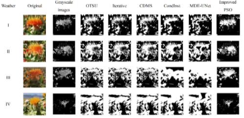 为验证该研究改进粒子群优化算法在复杂背景下的适应性和有效性,以400幅不同天气光照下的红花图像进行检测。与迭代法和OTSU法的分割结果对比,以此来评估本文算法的各项性能。试验结果表明,与其他方法的分割结果相比,该研究方法通过粒子群算法优化得到的灰度化处理红花区域得到增强,能够从其他红花、强光照叶子等的复杂背景中准确分割出红花。同时,该研究方法能够比较有效地克服非均匀光照带来的强光影响,多云光照条件下仍取得良好的分割效果(图1)。