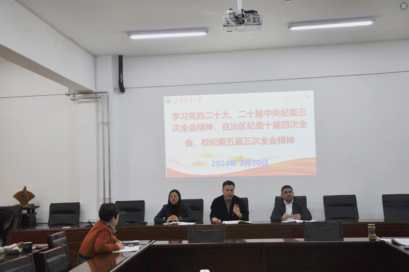 会议深入学习了习近平新时代中国特色社会主义思想,党的二十大、二十届中央纪委三次全会、自治区纪委十届四次全会精神;学院党委书记伊力达尔·伊力亚斯向全体教职工传达了中共星空彩票体彩版第五届纪律检查委员会第三次全体(扩大)会议暨2024年党风廉政建设和反腐败工作会议内容,组织学习了校党委常委、纪委书记、监察专员刘英同志所作纪委工作报告;总结了学院2023年党风廉政建设和反腐败工作;围绕校党委书记谢树青同志在学校党风廉政建设和反腐败工作大会上的讲话,伊力达尔·伊力亚斯部署了2024年相关工作任务。
