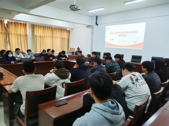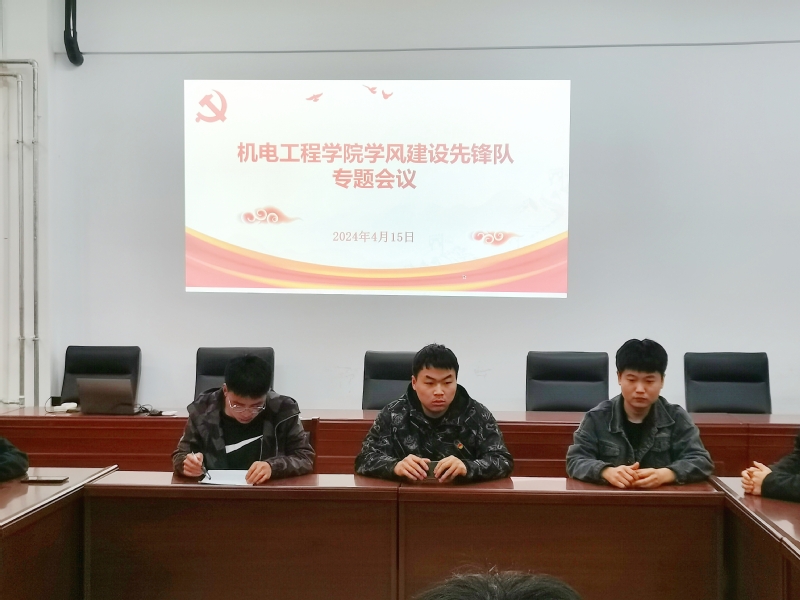 为加强我院学风建设,切实做好本科教育教学审核评估迎评工作,各学生支部由党支部书记牵头,党支部副书记为第一责任人,根据本支部学生党员组成情况组建学风建设先锋队。4月15日下午,机电工程学院学风建设先锋队在学院会议室召开第一次专题会议。此次专题会议由学生第三党支部副书记冉鑫主持。