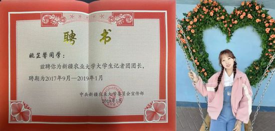 科研之外,她在校园媒体中不断突破自我,从大学生记者团办公室(现新秾融媒体工作室综合事务部)部员起步,她主动跨越部分边界,学习采访、撰稿、摄影、排版等多项技能,坚信“人不该局限于一个角色”,凭借全面的能力与不懈的热情。她随后在2018年担任第九届大学生记者团(现新秾融媒体工作室)团长,运营学校官方微信公众号、微博等平台。2017年,她策划的“新疆十三个世居民族大团结”专题报道被《新疆日报》等媒体转载,向外界展示了多元而温暖的新疆形象,从默默参与到组织引领,她完成了从内向到自信的蜕变。