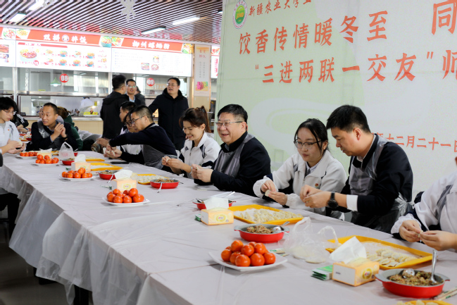 “冬至大如年。”在这个北半球白昼最短、思念最长的传统节气里,饺子不仅是一种食物,更承载着“团圆美满”“新旧交替”的美好寓意。谢树青一行来到石榴园餐厅,与来自天南海北的学子们围在桌旁,一边包着饺子,一边询问着大家的学业与生活。手指翻飞间,各式各样的饺子逐渐摆满案板——有家乡的手法,也有创新的形状。当一碗碗圆润饱满的饺子在氤氲热气中被端上桌时,许多同学笑着说:“虽然离家千里,但这口热乎的饺子,让我想起了家的味道。”