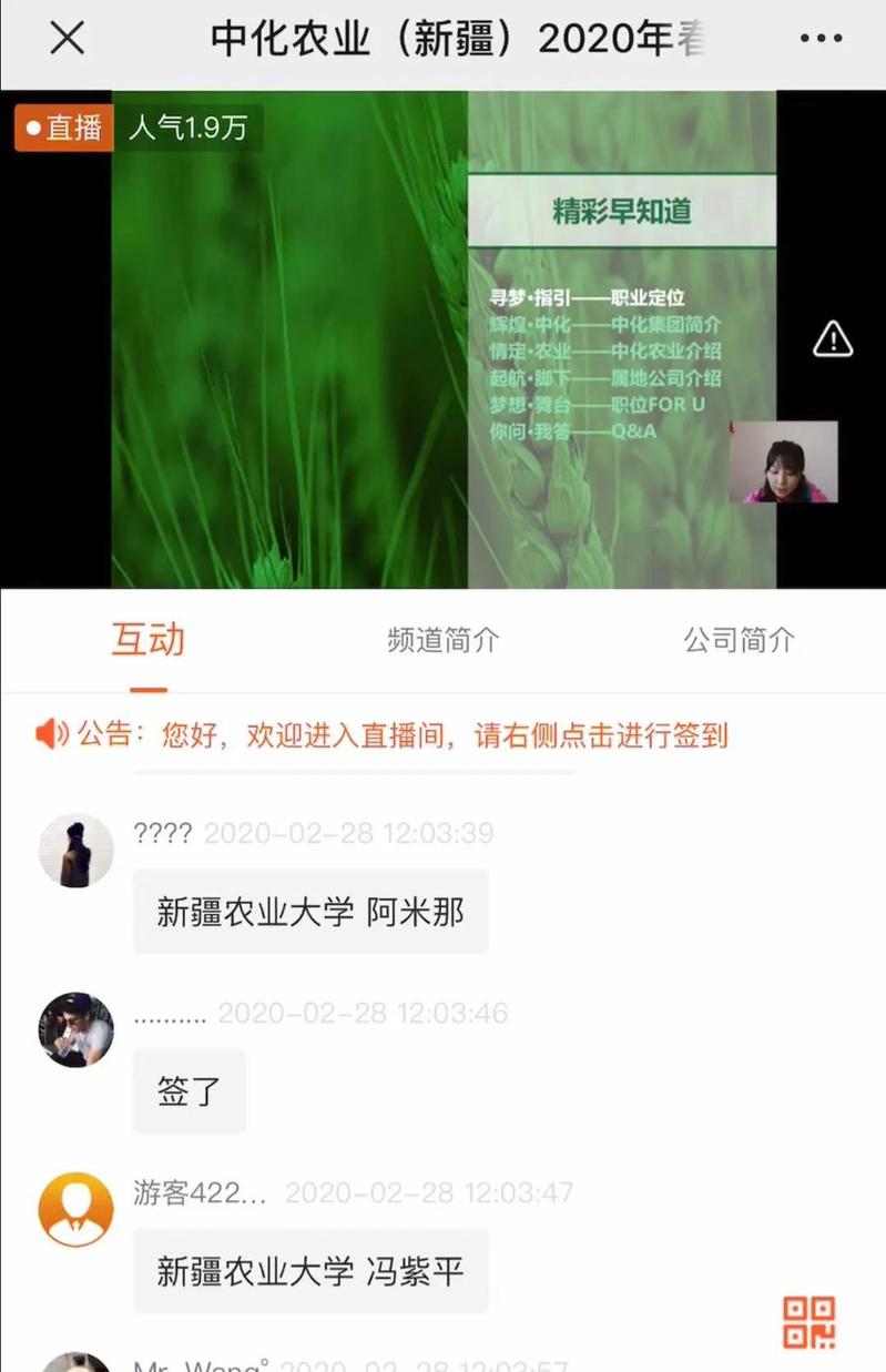 2020年2月28日上午12:00,农学院联合中化现代农业有限公司新疆分公司开展了一场别开生面的线上招聘宣讲会,农学院全体应届毕业生参与了此次线上宣讲。打破传统的线下招聘模式,探索线上招聘的新渠道。