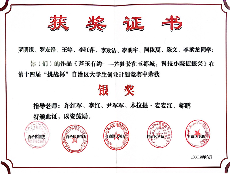 【基地简介】:新疆洛浦芦笋科技小院依托新疆科协、星空彩票体彩版、和田地区科协、洛浦县科协成立。星空彩票体彩版为首席支撑单位、园艺学院副院长许红军副教授为首席专家,目前小院有2名常驻研究生。小院设施设备有宿舍、厨房、厕所、洗衣机等,为入驻研究生提供良好的生活条件。在2024年第十四届挑战杯自治区大学生创业计划竞赛中,小院成员把在科技小院的故事讲述出来,获得了自治区银奖。