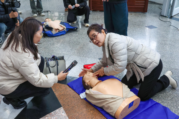 接着,由红十字协会王苏兰老师和乌鲁木齐消防支队高新技术产业开发区大队新医路中队的教官为在场师生讲解心肺复苏技术、AED使用方法和灭火器操作事项。