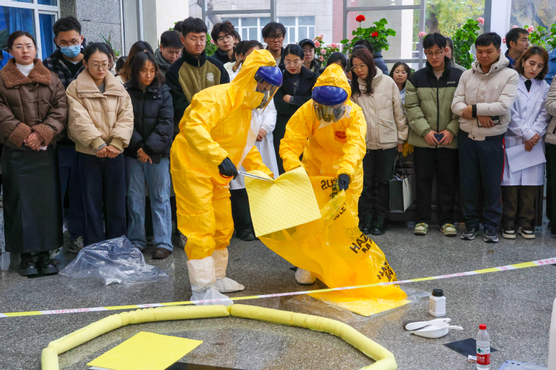演练中,我校实验室相关人员“本色出演”安全员、应急处置组、后勤保障组。学生模拟实验过程中不慎造成危化品泄漏,在安全员的指挥下迅速展开应急处置工作。主要包括实验人员有序撤离、现场封锁和警戒、逐级上报、人员防护、危险源消除、现场恢复等一系列规范化应急处置流程。