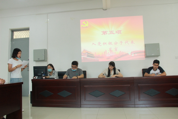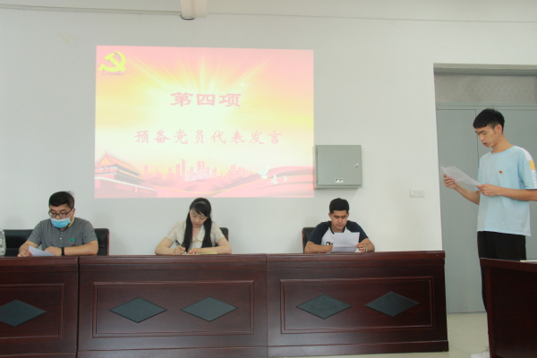 入党积极分子代表周玉莹同学发言:今天有幸特邀参加了党支部主题党日活动,心情非常激动,向党组织靠拢的决心更加坚定,“我们要通过学习党的科学理论知识提高自身理论水平、树立正确的人生观、价值观和世界观,实现学习科学文化与加强思想修养的统一,努力实现学习书本知识与投身社会实践的统一,努力把自己锻造成党和人民需要的、符合时代要求的新时代大学生。”
