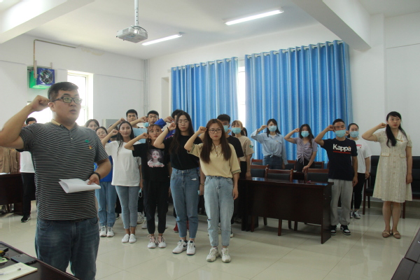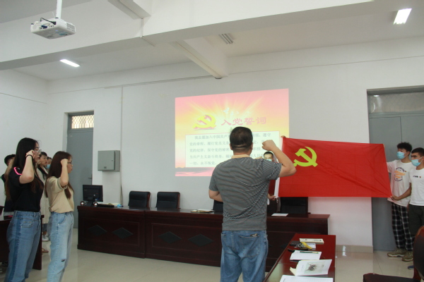 在学生第一党支部书记鲁德渊同志带领下,十三名新发展党员面向鲜红的党旗,举起右手握拳庄严宣誓,庄重表达为共产主义事业奋斗终身的雄心壮志。