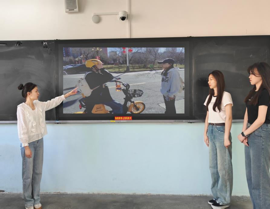 图3 交运(专升本)2301陈佳雪、交运(专升本)2302何馨雨、郭水水三位同学与学校保卫处工作人员一起通过情景剧的方式展示《校园非机动车行驶不良行为和出行建议》