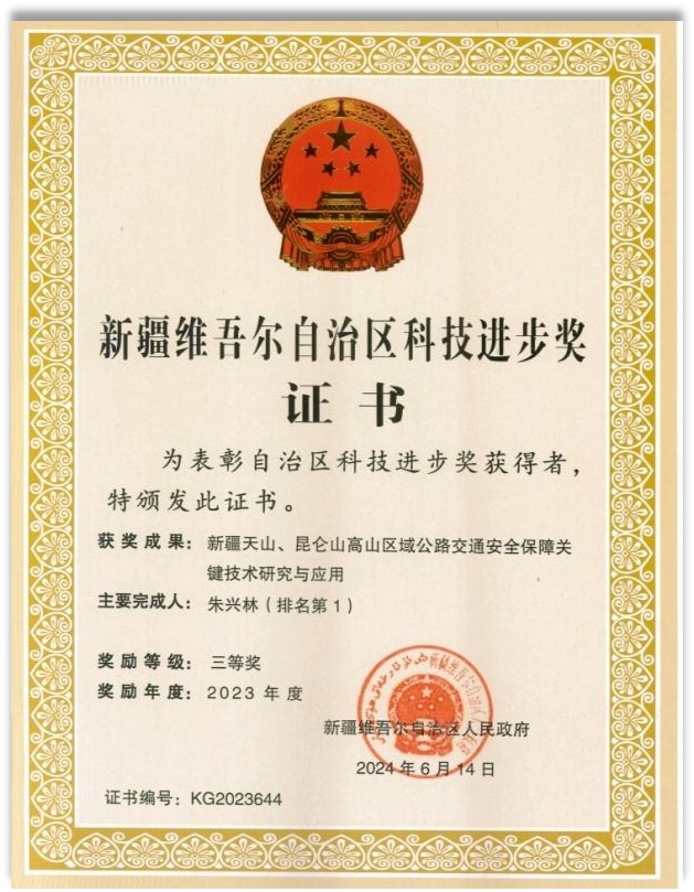 近日,自治区人民政府公布了《2023年度自治区科学技术奖获奖成果和特等奖获奖人员的决定》,我院朱兴林副教授科研团队研究成果《新疆天山、昆仑山高山区域公路交通安全保障关键技术研究与应用》喜获自治区科学技术进步三等奖,这是自建院以来首次获此殊荣。