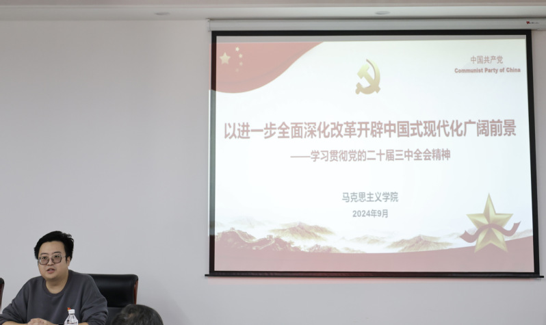 王嘉辰老师以《进一步全面深化改革开辟中国式现代化广阔场景》为主题,围绕新征程中国式现代化“动员令”、新时代全面深化改革“成绩单”、进一步全面深化改革“路线图”和加快建设教育强国的“强引擎”等四个方面,对党的二十届三中全会精神进行系统全面的阐释。宣讲内容脉络清晰,深入浅出,贯通历史和现实,对全院教师深刻认识到党的二十届三中全会的重大时代意义和深远历史影响,深刻领会到进一步全面深化改革的重大原则具有重要的指导作用。