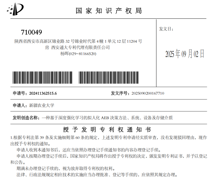 近日,我院周文亮老师主导研发的“一种基于深度强化学习的拟人化AEB决策方法、系统、设备及存储介质”获得国家发明专利授权(专利号:CN202411362515.6)。此项成果标志着我院在汽车智能安全控制领域的研究取得了新突破,为解决自动驾驶核心安全问题提供了“拟人化”解决方案。