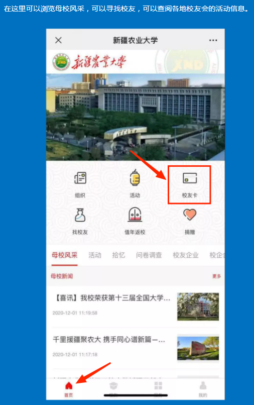 (收到注册成功短信后,可在首页点击“校友卡”,按要求填写学籍信息和上传一寸照片【蓝底或红底】,申领校友卡)