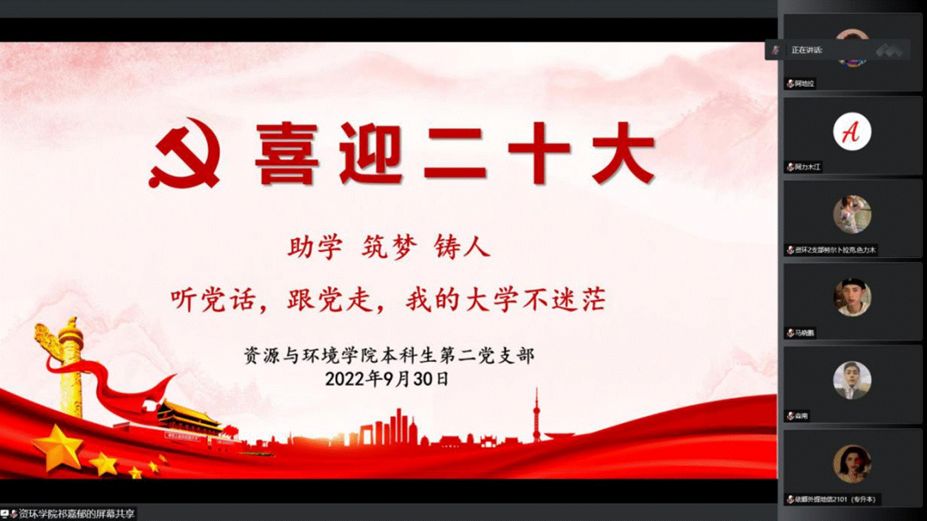 为庆祝中华人民共和国成立73周年,喜迎党的二十大胜利召开,引导广大同学感恩励志、勇敢逐梦,资源与环境学院本科生第二党支部于9月30日,线上开展“听党话,跟党走,我的大学不迷茫”主题党日活动。