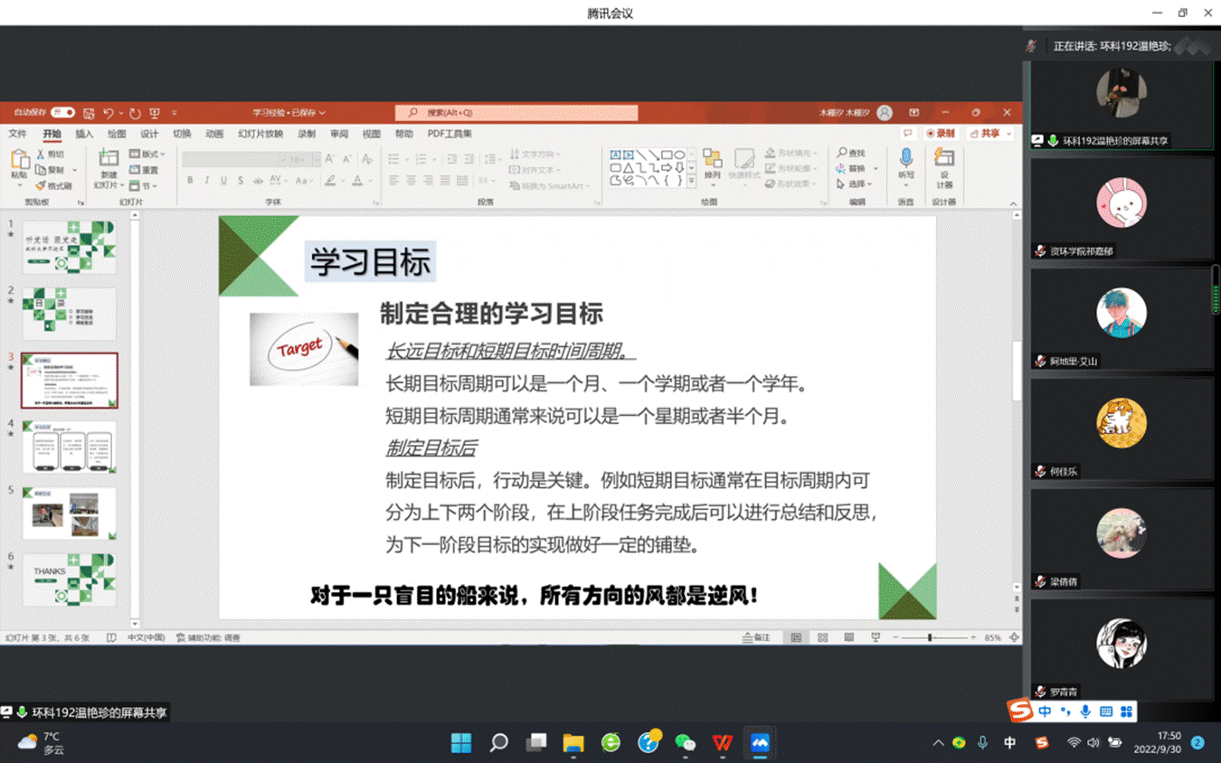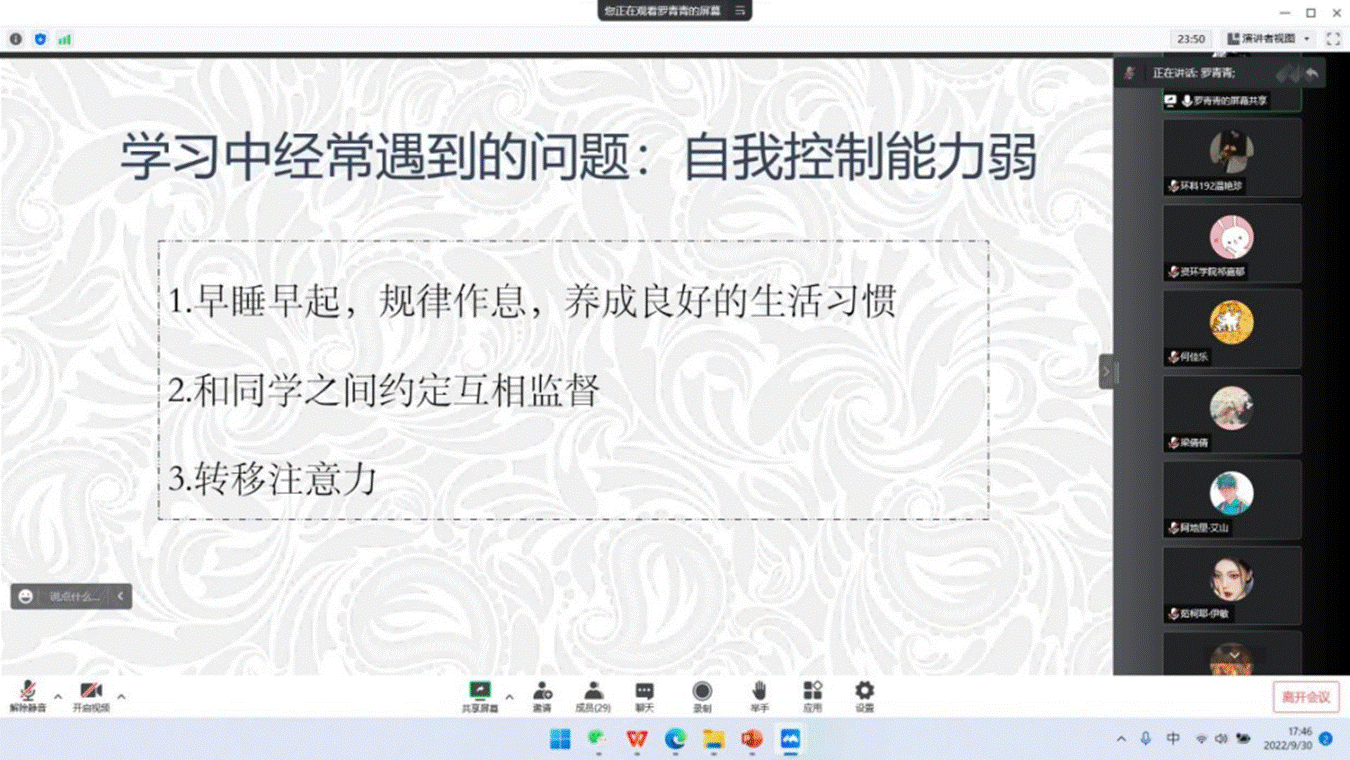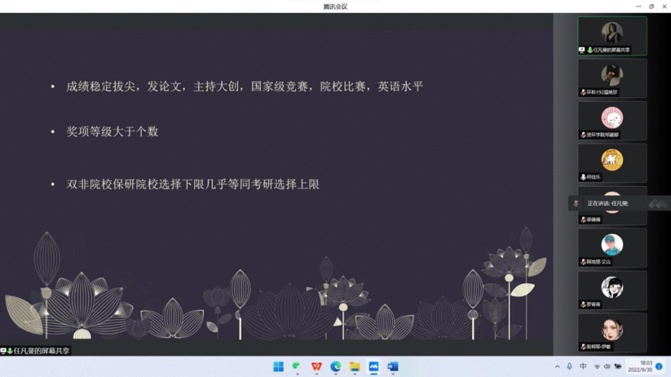 本次活动由资源与环境学院本科生第二党支部书记祁嘉郁主持,邀请到本学年两位拟推免研究生:何佳乐、任凡斐与四位本学年奖学金拟获得者:梁倩倩、阿地里·艾山、罗青青、温艳珍为大家进行经验分享。