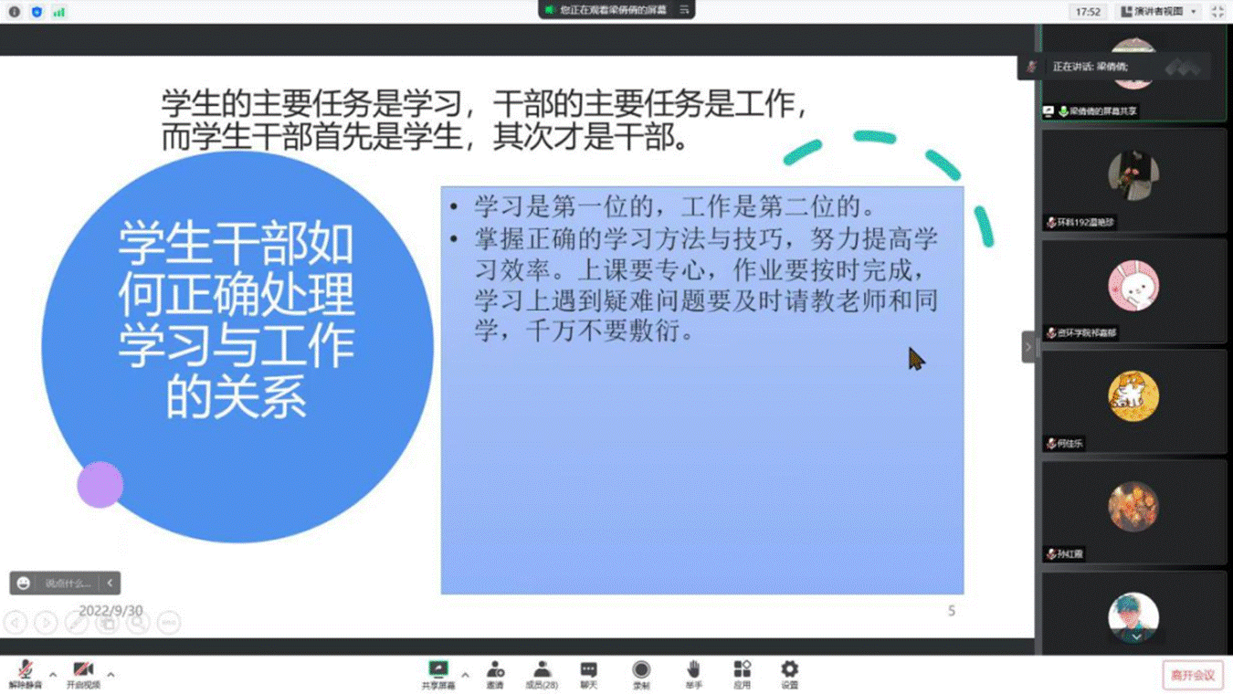 梁倩倩同学就“学生干部如何正确处理学习和工作的关系?”这一问题与大家进行交流。大学生活是丰富多彩的,作为学生,学习是第一位,作为学生干部,学生在首位,干部在其后。