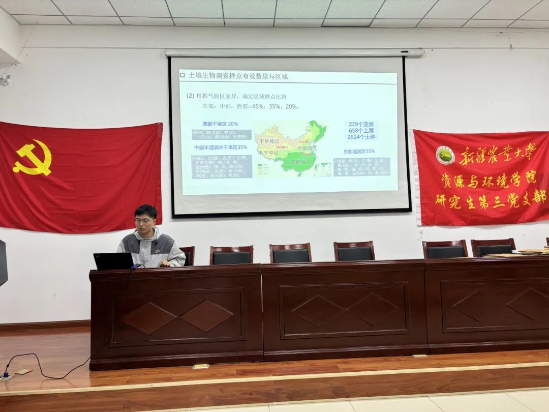 李伟同志以“氮肥减量配施有机肥对库尔勒香梨园土坡酶活性与根活力的影响”为题分享自己近一年以来在氮肥减量配施有机肥对库尔勒香梨中的试验进展情况。随后,寇天乐以“第三次全国土壤普查-土壤生物调查技术”为题分享自己在今后一年的工作计划,并向同学们普及了土壤生物调查在采样方法、生物指标测定、实验室分析等关键要点。